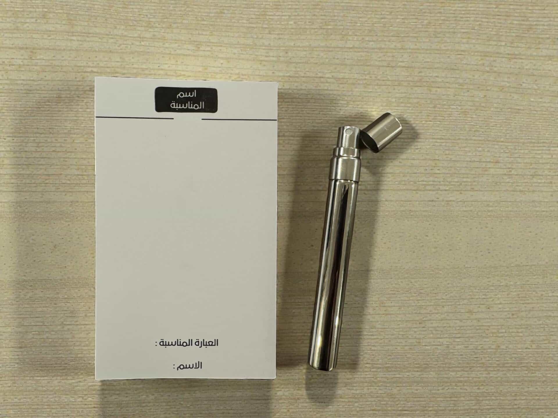 Mini perfume spray favor in Kuwait featuring a 10ml mini perfume spray paired with a plain white card and an elegant black ribbon.