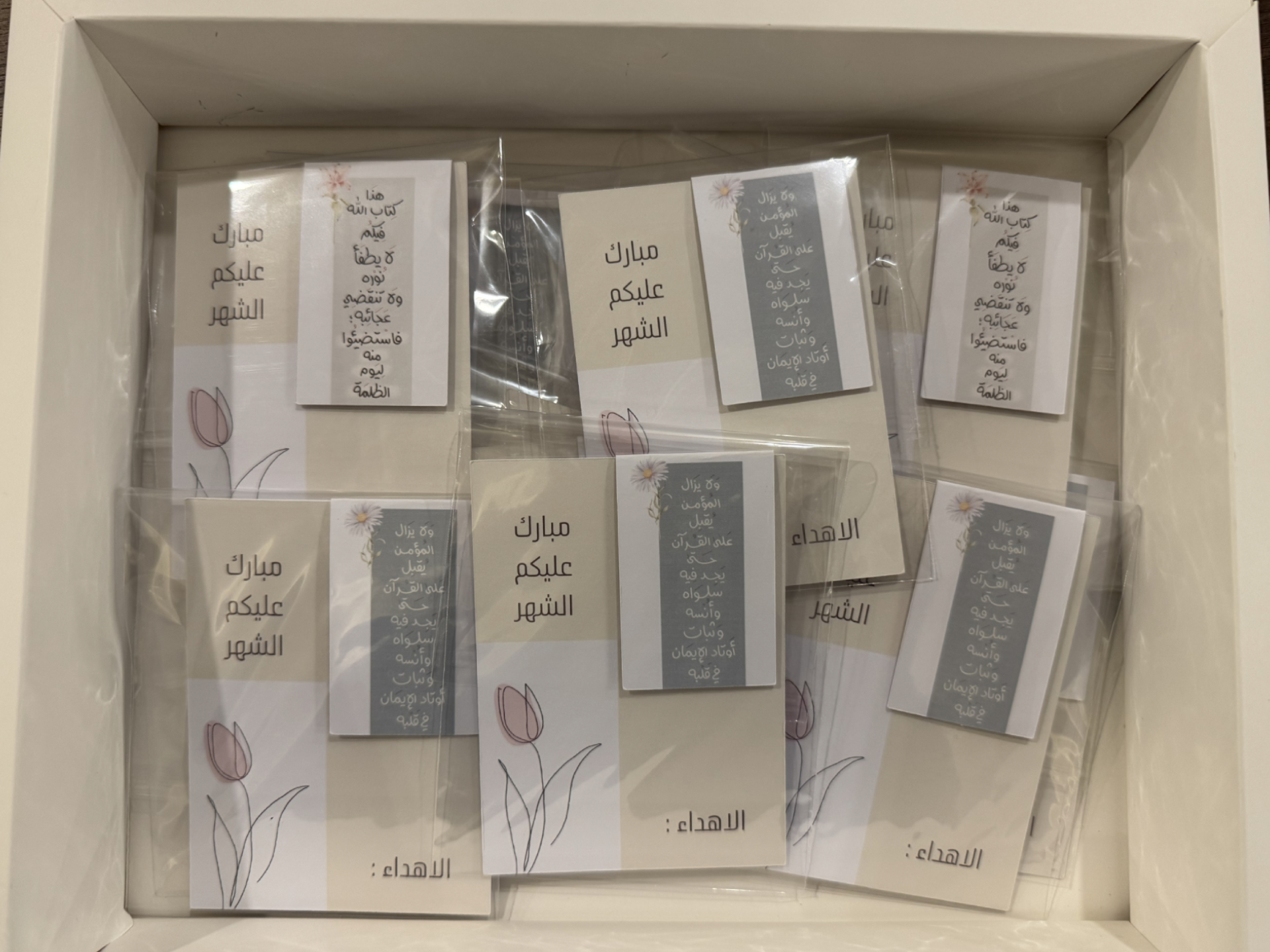 A Ramadan-themed favor set featuring a greeting card with “مبارك عليكم الشهر” and a beautiful magnetic bookmark with selected Arabic phrases—perfect for gifting and giveaways.
