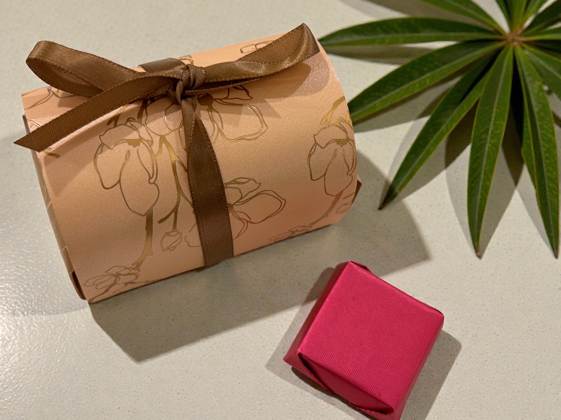 توزيعة بوكس شوكولاتة أنيقة تحتوي على حبة شوكولاتة بلجيكي مع شريطة ساتان وكرت مخصص للمناسبة.