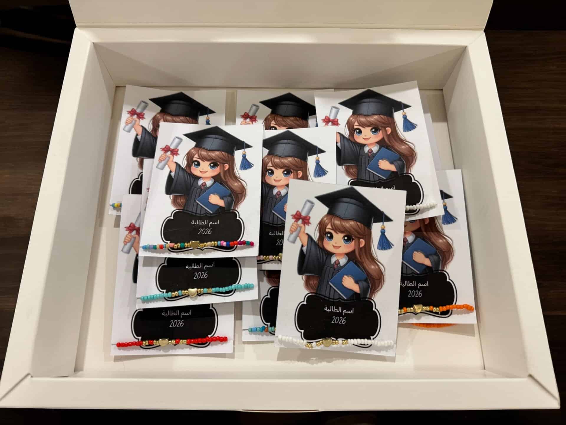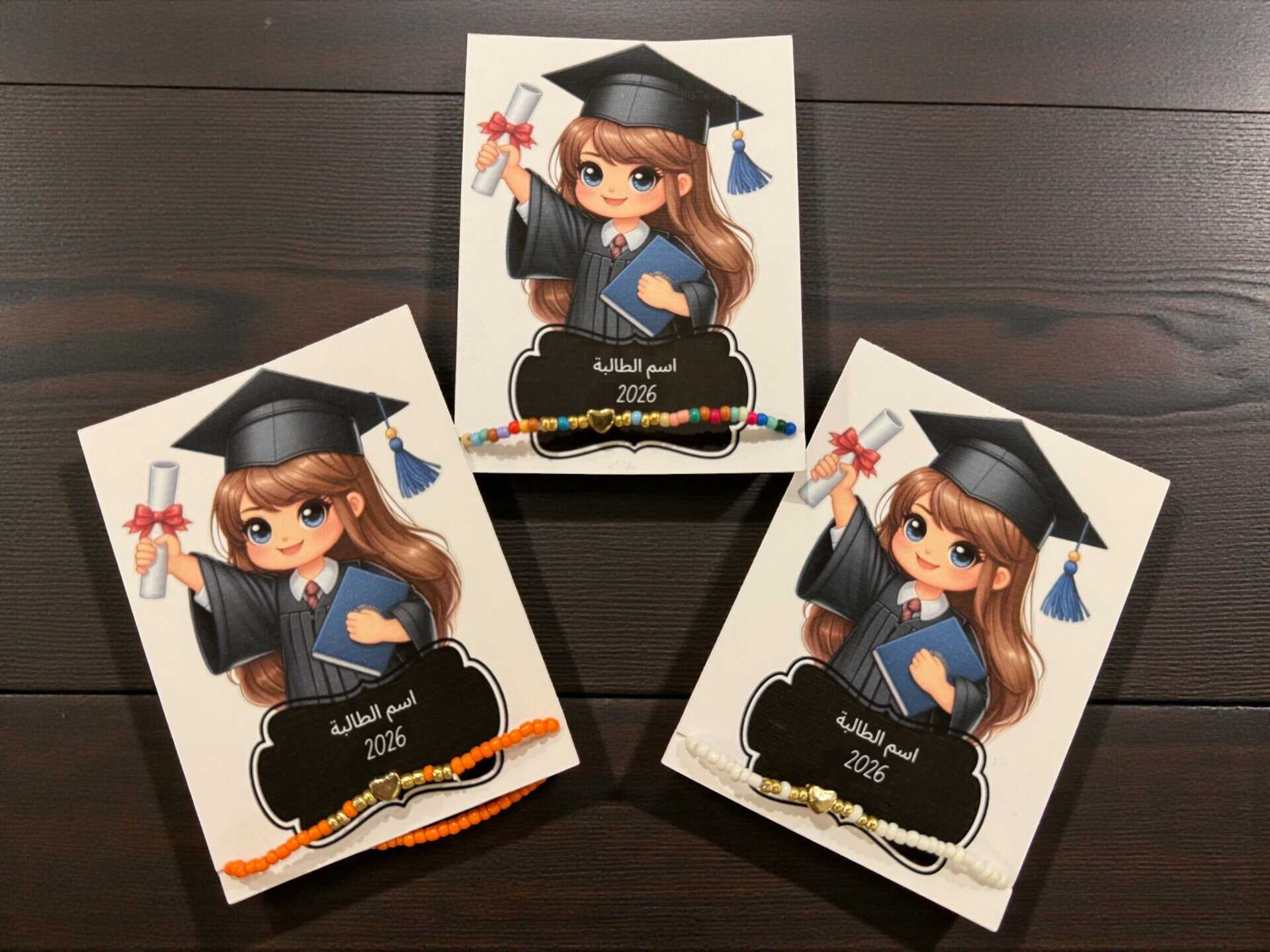 توزيعة بنت تخرج مع اسوارة من ناومي مصممة خصيصًا لحفلات تخرج البنات والتفوق المدرسي. يحمل الكرت صورة فتاة كرتونية بقبعة التخرج وشهادة في يدها، مع مساحة مخصّصة لكتابة اسم الطالبة أو المعلمة مع السنة الميلادية مثل 2026، لتصبح التوزيعة تذكارًا شخصيًا جميلًا من هذه المرحلة.