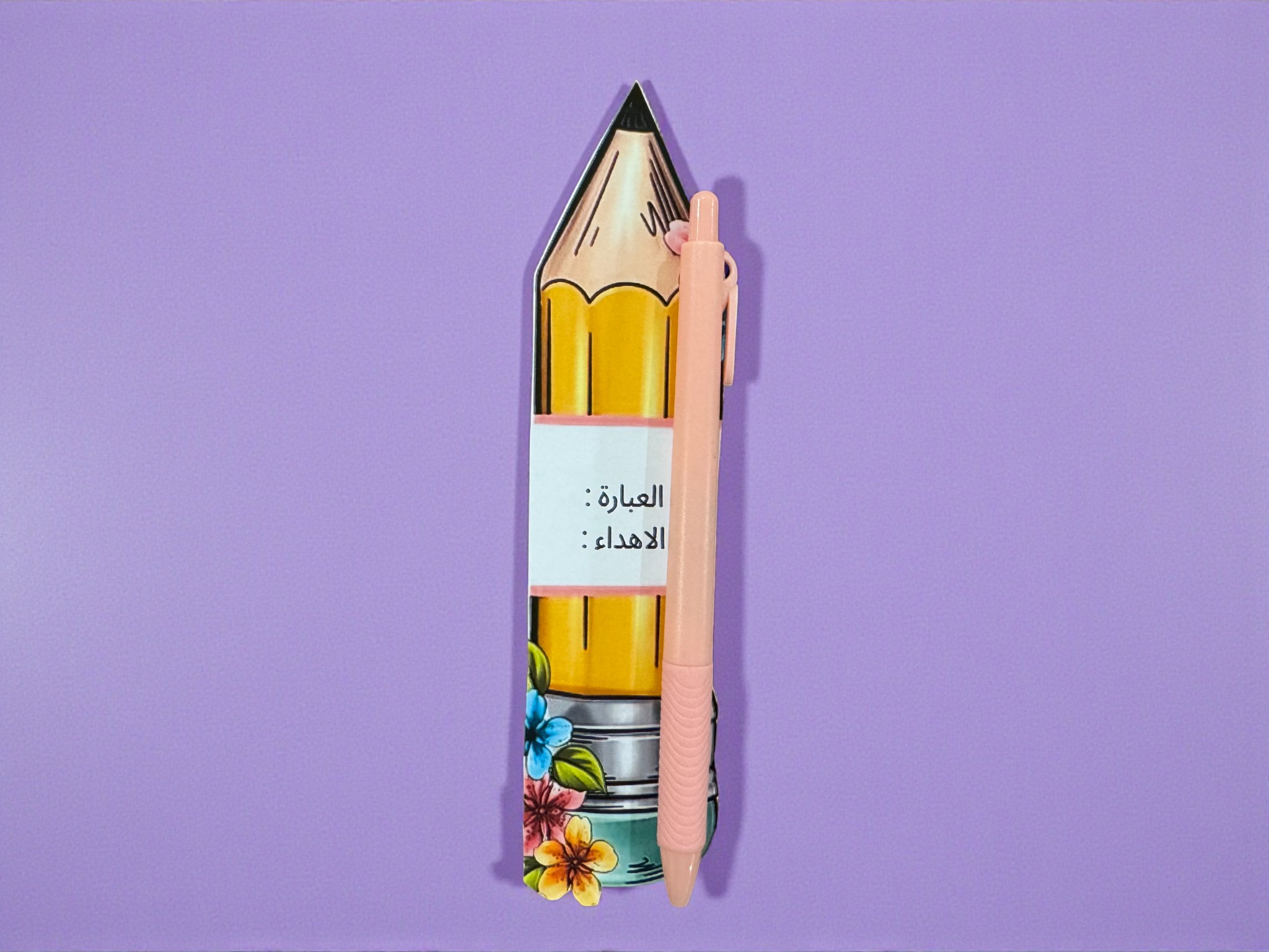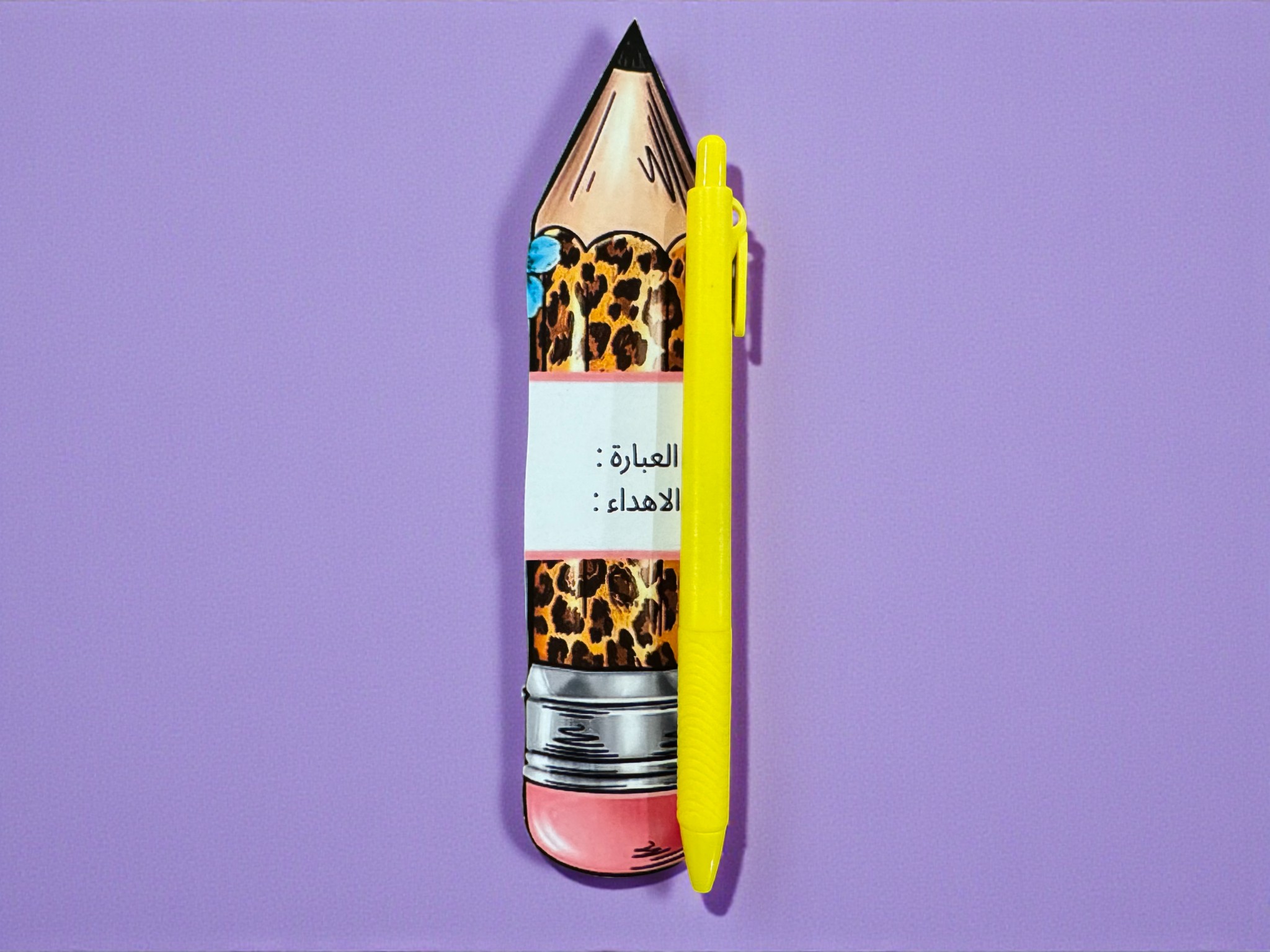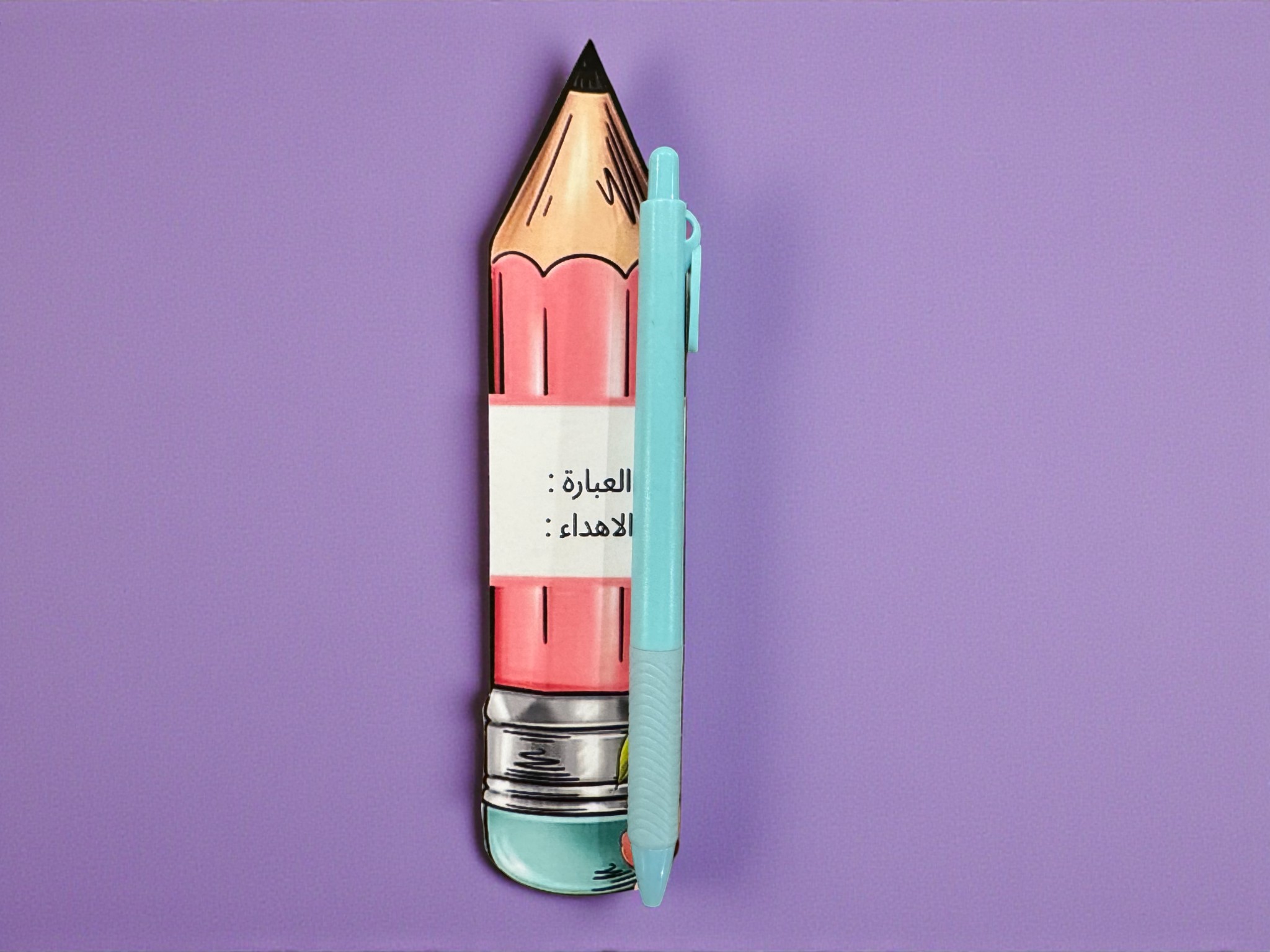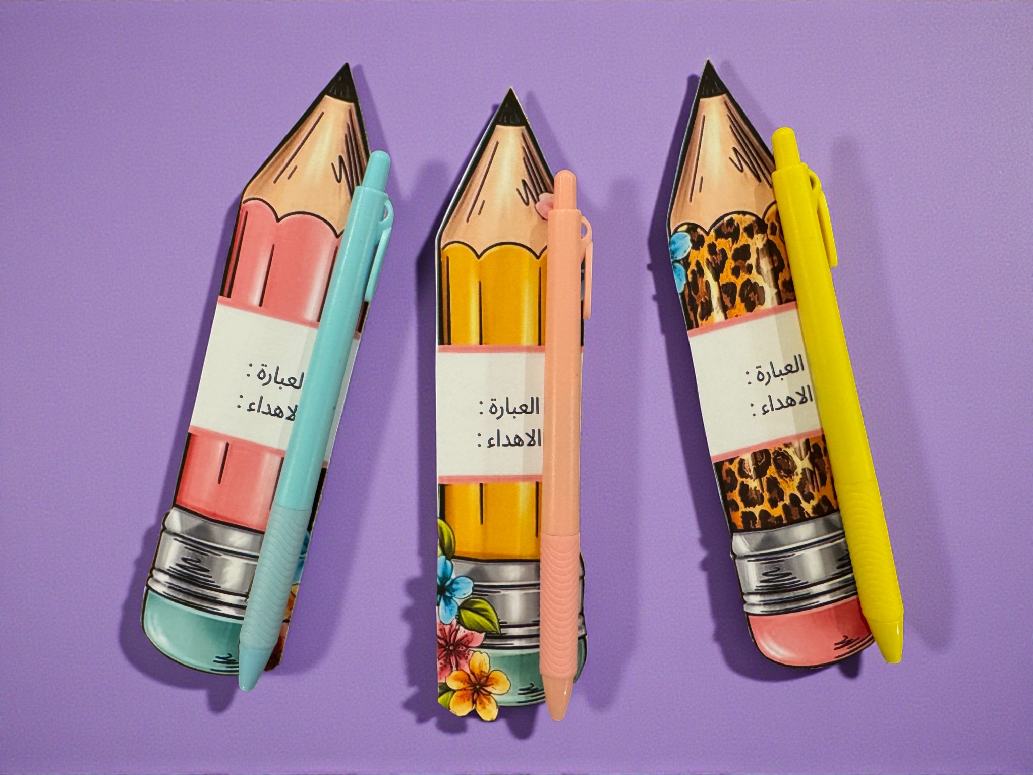 توزيعة بشكل قلم رصاص بتصاميم وألوان مختلفة، مع قلم حبر أزرق—مع إمكانية إضافة العبارة والإهداء.