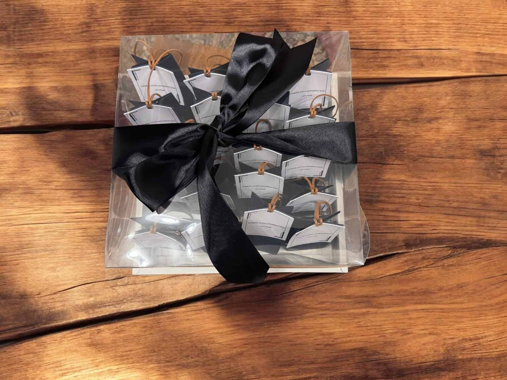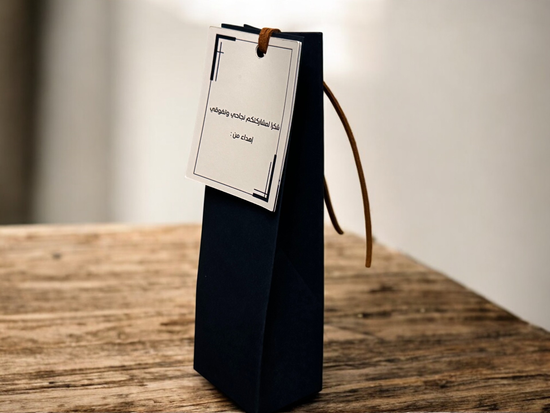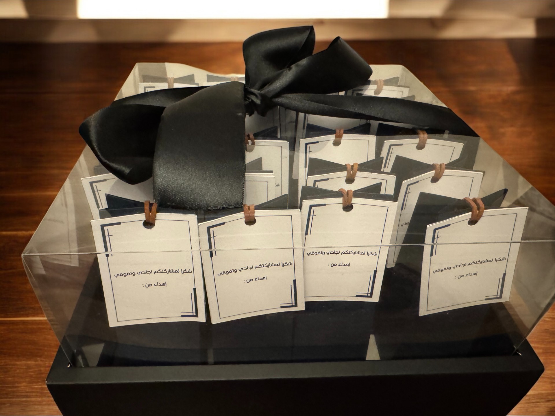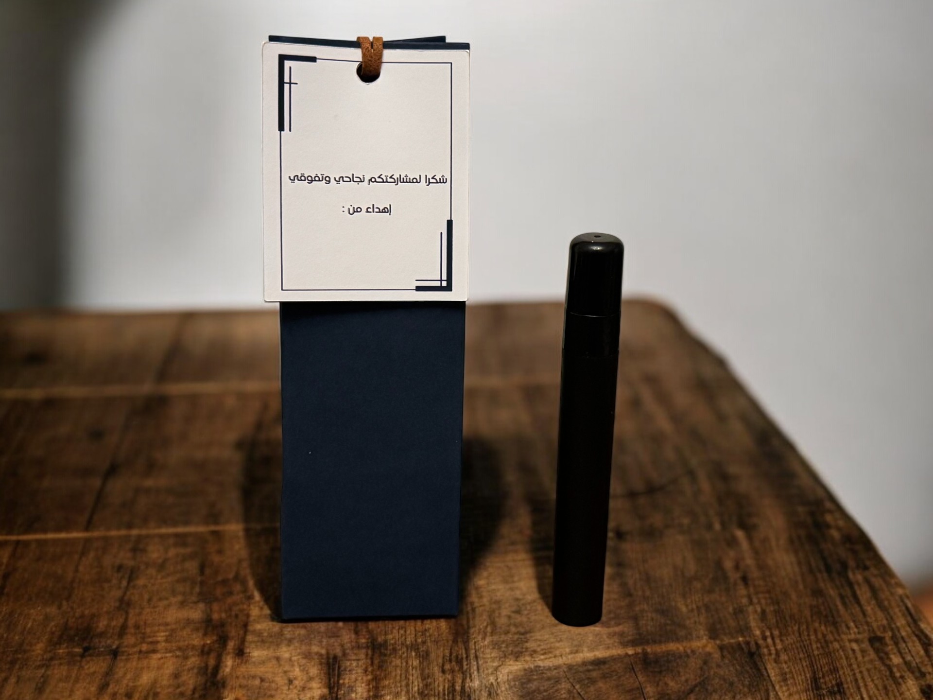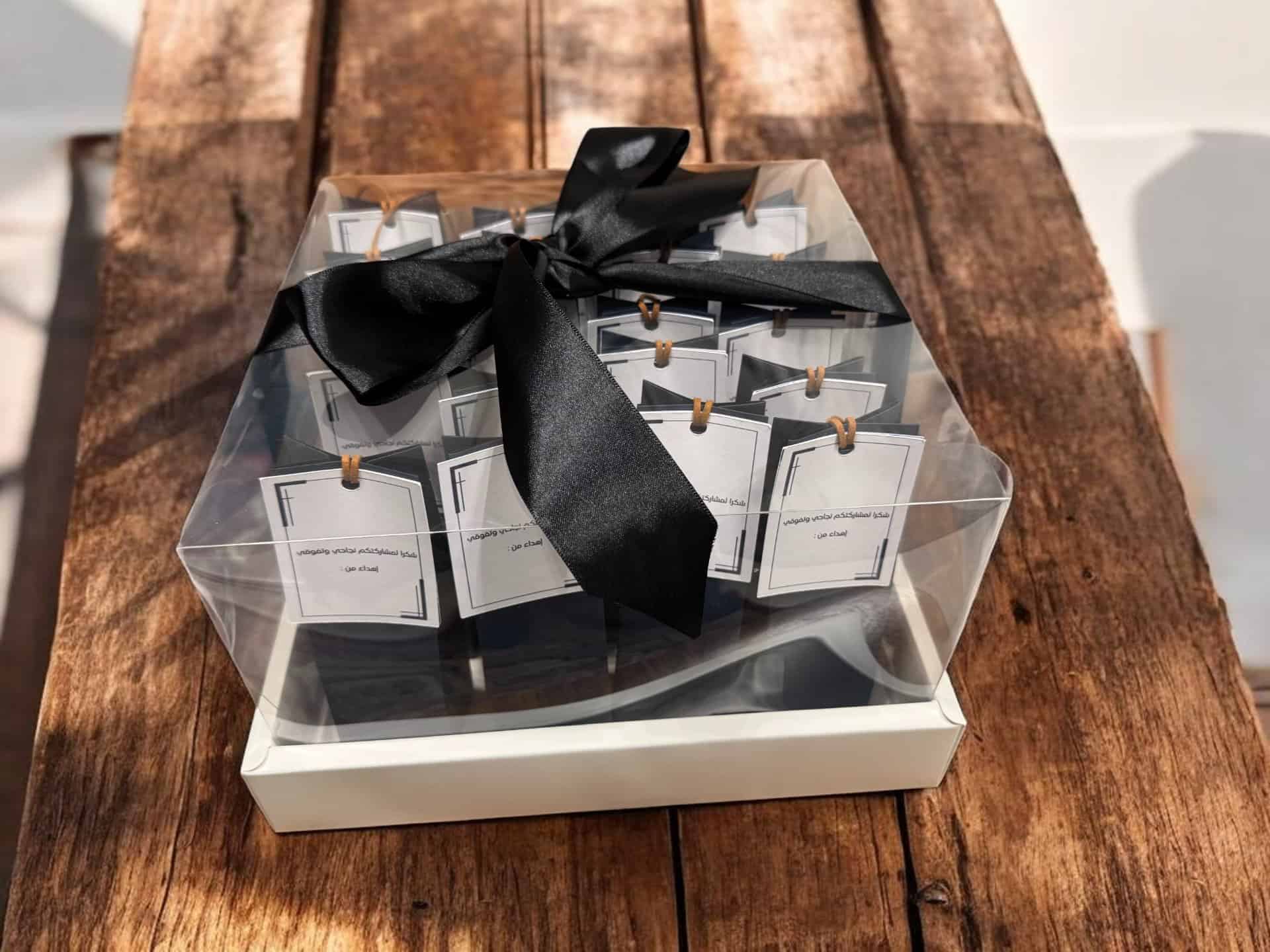 توزيعة العطر بوكس هي هدية راقية وعملية، عبارة عن علبة باللون الناڤي مزودة بـ شريطة جلد بني، وبداخلها عطر (10مل) بعلبة باللون الأسود. كرت الإهداء يكون في الخارج لإضافة لمسة شخصية على التوزيعة.