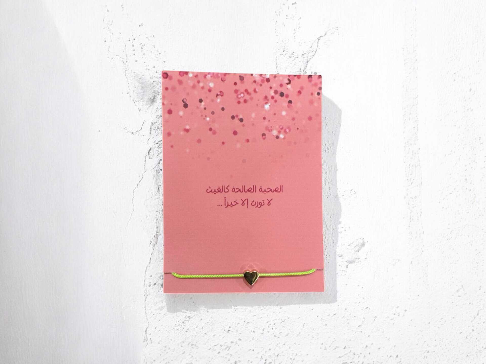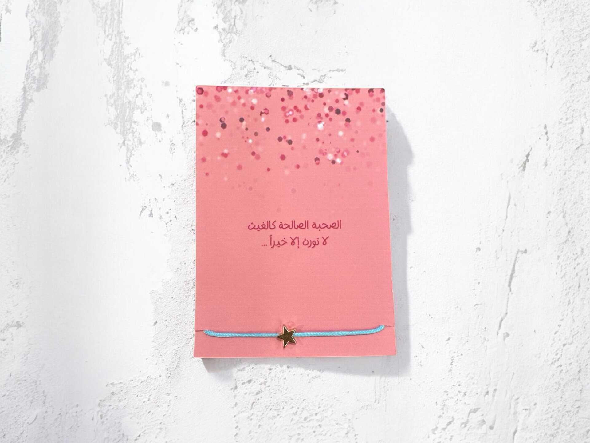 توزيعة الكرت الوردي في الكويت مع بطاقة أنيقة وسوارة قابلة للتعديل بتعليقة قلب أو نجمة. بسيطة، راقية، وجاهزة للتقديم في أي مناسبة.