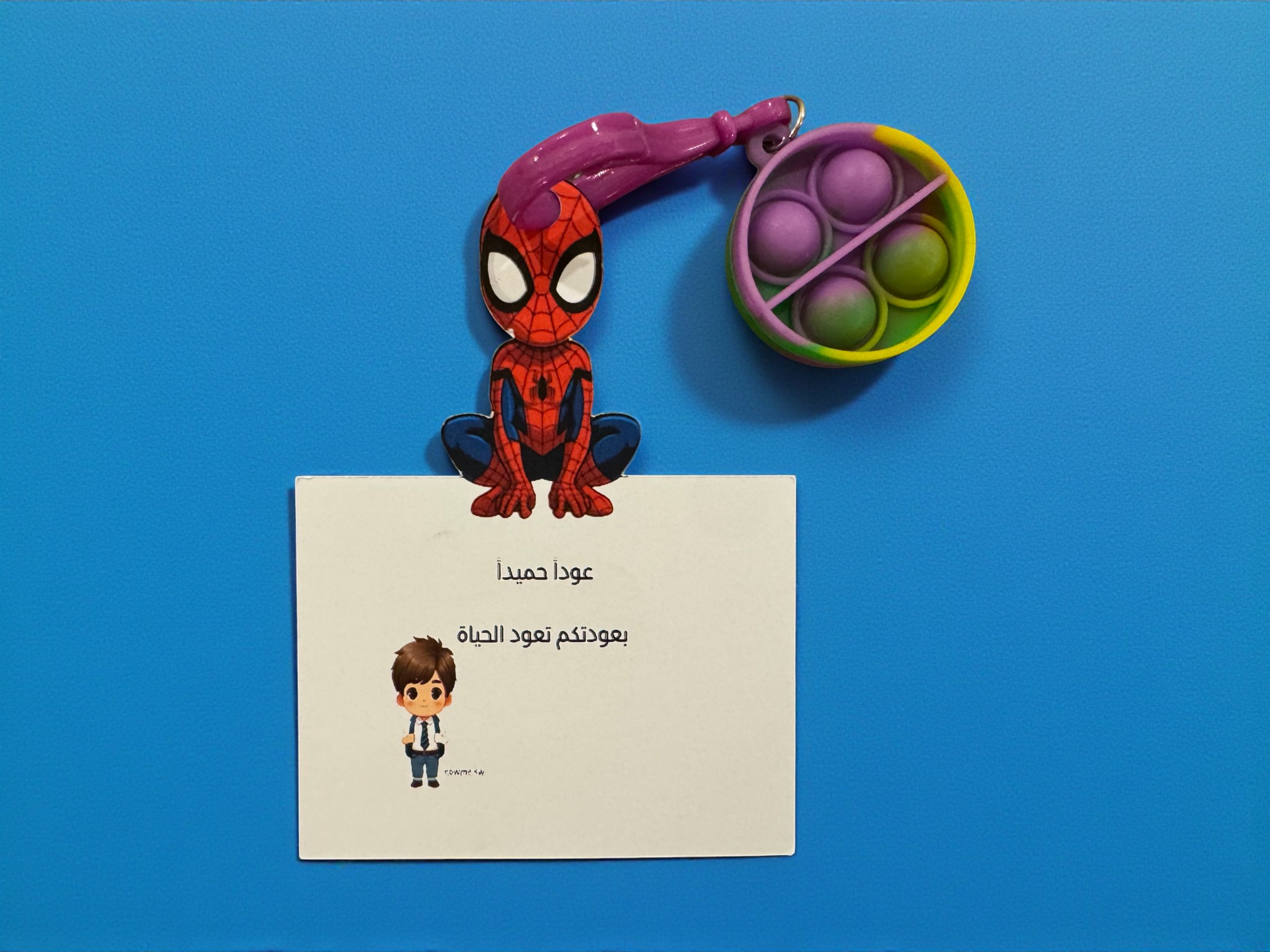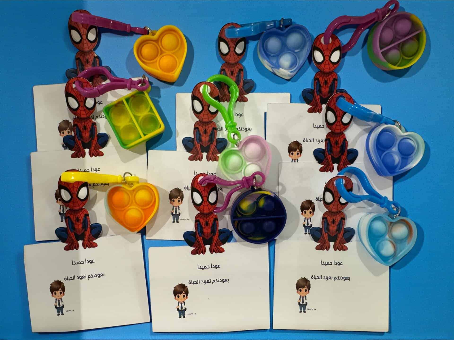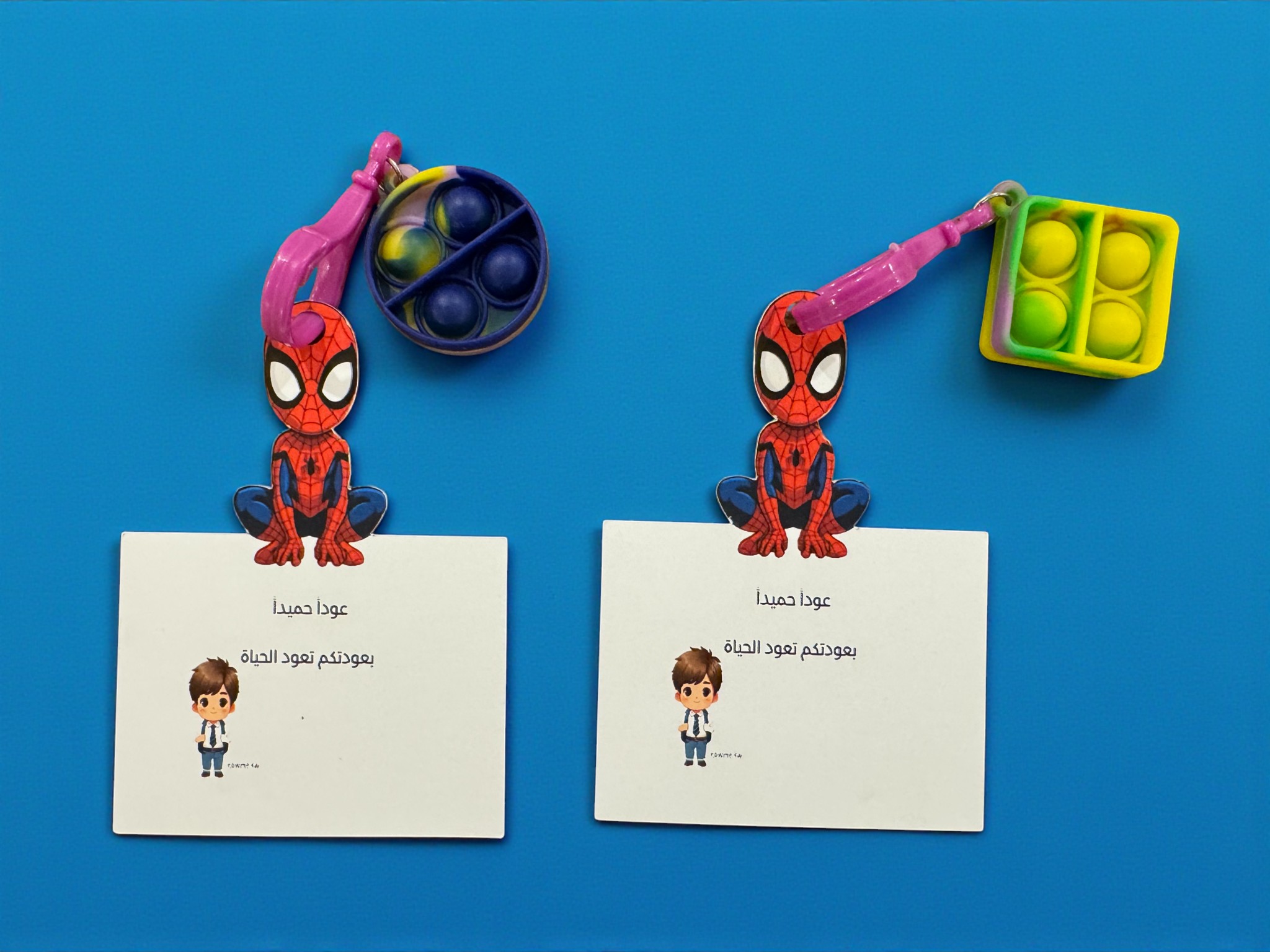 توزيعة البابلز سبايدر مان من ناومي مناسبة للأولاد، تجمع بين كرت بتصميم سبايدر مان مع ميدالية بابلز (Pop-it) كقطعة مسليّة يمكن تعليقها على الشنطة أو استخدامهاللعب الخفيف.